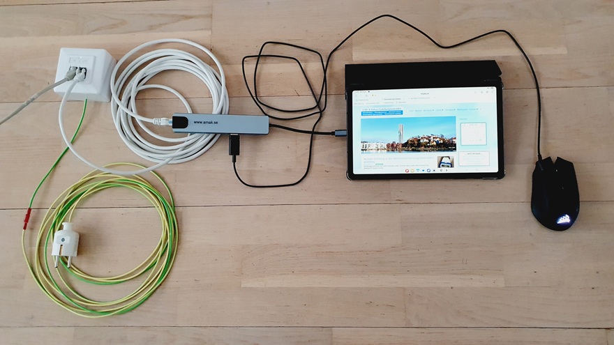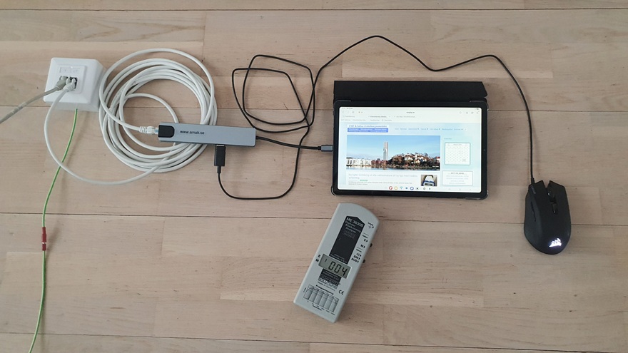 Det går också bra om man byter ut det skärmade nätverksuttaget mot en router eller en switch i plåt som är ansluten till jord med jordad stickkontakt och sitter i ett jordat uttag som i sin tur ansluter jorden till skärmen på kabel och vidare till adaptern och in till surfplattan.
